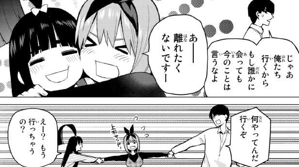 前回、一花と三玖の休日デートのお誘いを断って結果的に四葉とデートをしていると一花と三玖に出くわしてしまいます。まだ見つかっていませんが、もし見つかったら何と言われるか分かりません。