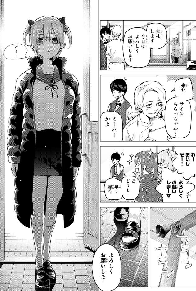 しかし4人とも希望のバイトを言いますが、どれもうまくいきそうにありません。五月は家庭教師を、四葉はスーパーの店員を希望しますが、風太郎から則クビと言われてしまいます。