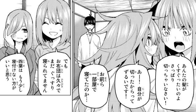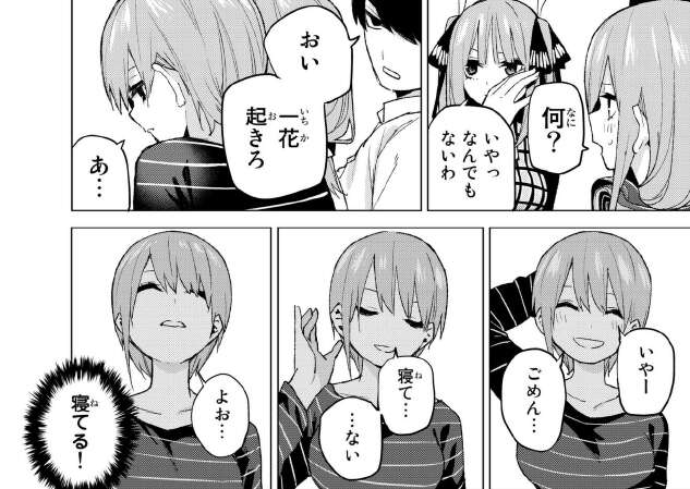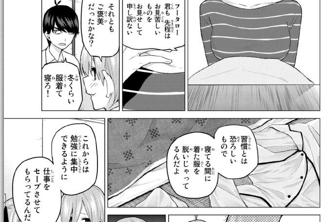 二乃の夢を話していると、またしても一花が寝ぼけて服を脱ごうとして二乃と五月から怒られます。この仕事を舐めていたことを、後悔する風太郎です。