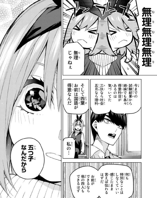 各々、得意科目を風太郎と一緒に教える事で、風太郎が教えられない所をカバーする方法のようです。三玖なら社会、五月なら理科と言った感じで得意な科目を教えれば、他の姉妹にも伝わるはずだと、五つ子だからだと風太郎は言います。