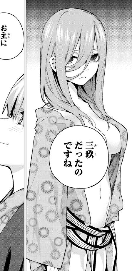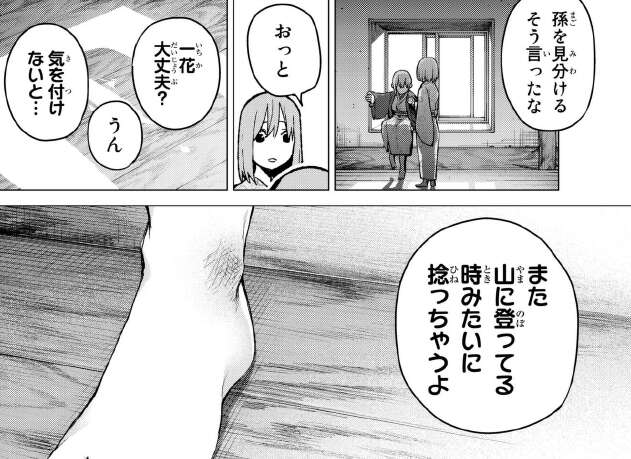 風太郎はお爺ちゃんから、何のために孫を見分けたいんだと言われます。そして、三玖と五月が温泉に入るとき、五月は三玖の足の傷を見つけます。