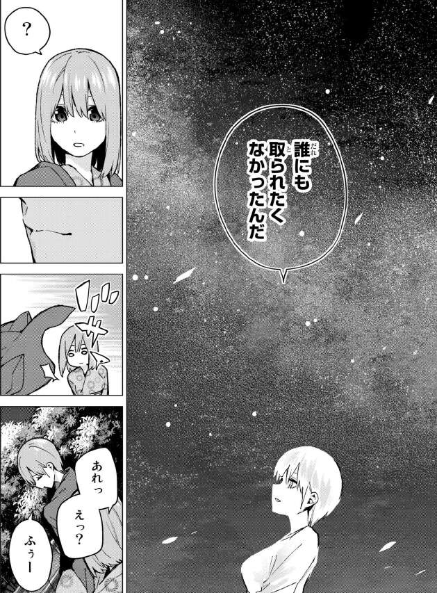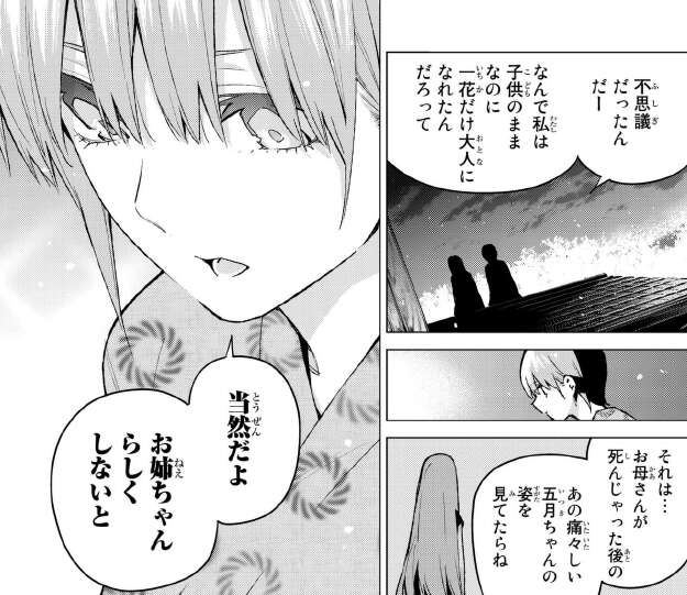 四葉から一花だけなんで大人になれたんだろと言われて、母親が亡くなった後の痛々しい五月の姿を見たらお姉ちゃんらしくしないと、と思ったそうです。