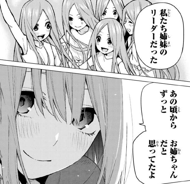 四葉は一花が一番でよかったと言い、姉妹のリーダーだった、あの頃からずっとお姉ちゃんだったと思ってたよと言います。そして、一花だけは我慢しないでしたいことして欲しいと言います。