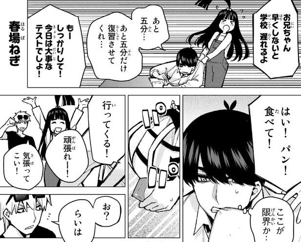 いよいよ、全国模試当日ですが、風太郎は直前まで勉強の復習をしていて、らいはに促されてやっと登校します。睡眠もろくにとっていないようで、目の隈がひどいです。