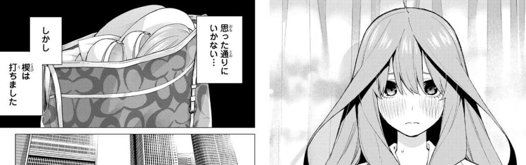 前回、修学旅行の班決めが終わり、いよいよ修学旅行直前となりましたが、五月はカバンに何かを準備しています。そこに四葉が現れて、最近 五姉妹の雰囲気が悪いのでまた仲良くなりたいと言い、五月もそうですねと言います。