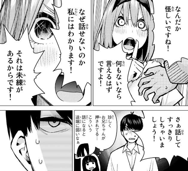 零奈は風太郎に会いたくて来たと言ったらどうすると逆に聞き返しますが、風太郎は五つ子の一人と見抜いており、いつも会っているだろうと返します。風太郎は何故母親の名前、零奈を名乗ったか質問しますが、零奈はとっさにだと言い、そして自分は五つ子の一人だと認めます。
