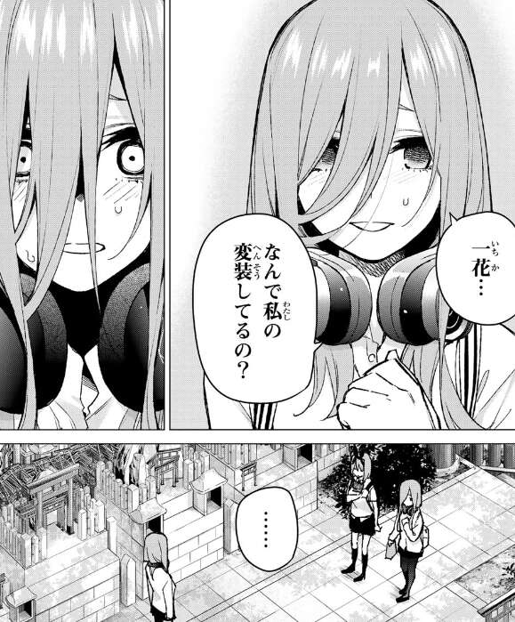 一花は頂上に着きますがまだ三玖と四葉、風太郎もおらず、右ルートの方へ降りていこうと急ぎます。そしてそこで三玖に変装した一花は、四葉と四葉におんぶされた三玖に会ってしまいます。