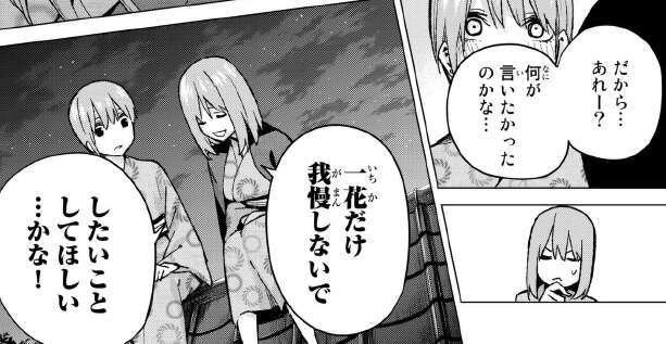 四葉は以前温泉旅館に泊まった時に、一花に我慢しないでしたいことをして欲しいと言った事があります。66話で一花と四葉が温泉旅館の屋根の上で、二人で話し合ったときですね。
