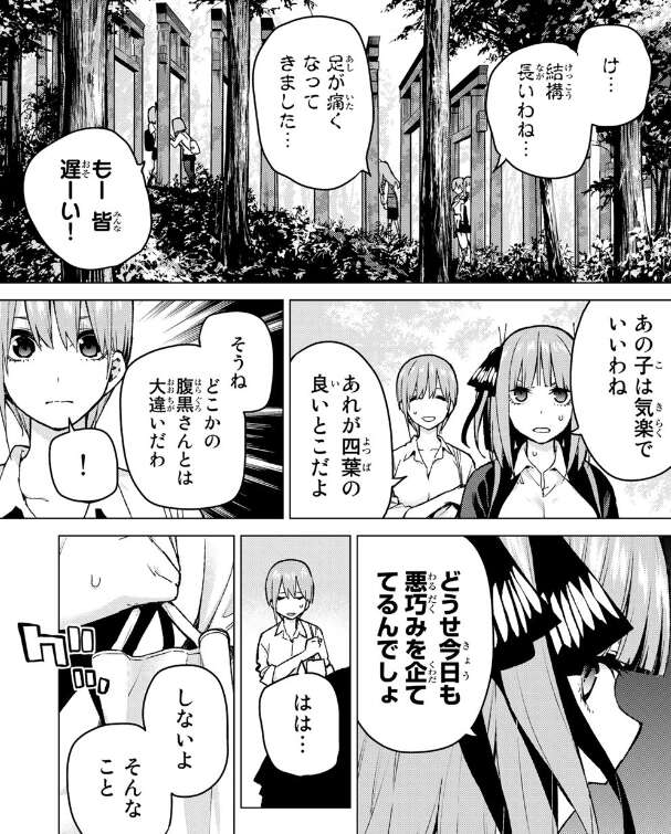 左ルートに、一花、二乃、五月、そして右ルートに三玖と四葉という組み合わせになりました。左ルートを進んでいる一花たちですが、右ルートが正規ルートのようで、一花は二乃に先に風太郎の班に合流されるかもと言われます。一方、右ルートの三玖と四葉は鳥居を登っていますが、三玖は既にバテ気味です。それでも二人で励ましあって、風太郎の班と合流しようとします。
