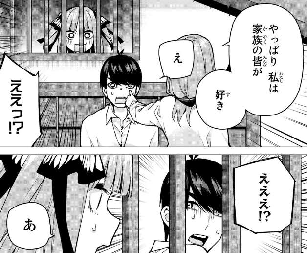 再び三玖の告白の場面に変わって、三玖は風太郎に好きだと言った直後、三玖はやっぱり私は家族の皆が好きだと言います。今の「好き」は隠れていた五つ子たち四人に向けた言葉でした。一花や二乃たちの声が三玖には聞こえていて、途中から四人が隠れている事に気付いていました。