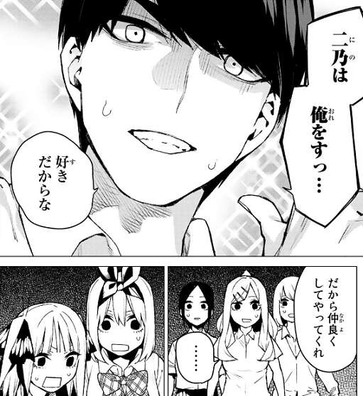 女子からなんで風太郎にそんなことわかるのかと言われますが、風太郎は精一杯笑顔を作りながら、二乃が好きなのは俺だから、女子が思っているようにたこ焼き派の中の男子を狙っていないから仲良くしてやってくれと言い放ちます。さすがに唖然とする女子3人と二乃と四葉ですが、二乃は風太郎が自分を陰で庇ってくれていてうれしそうです。