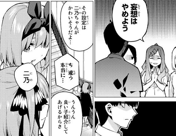 二乃は面倒を回避しようと別の方向に歩いて行こうとしますが、3人は風太郎と話しています。二乃が男子組の中にいて媚びを売っているのは、男子の誰かを狙っているに違いないという内容でした。しかし、風太郎は勘違いだと断言したこ焼き派の中に、二乃の意中の相手はいないから安心するようにクラスメイトの女子に話します。