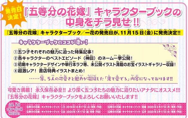 連載2周年に合わせて週刊少年マガジン 2019年36・37号上で発表されていましたが、アニメや展覧会など様々な企画も進行中ですが、五等分の花嫁 キャラクターブックの発売日が決定しました。