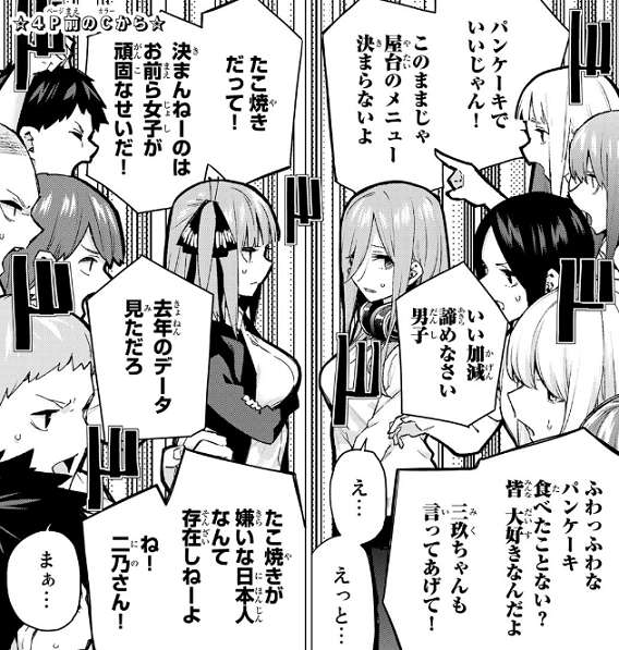 前回、学園祭に向けてクラスで屋台のメニューを話しあっていましたが、たこ焼きとパンケーキ、どちらがいいかでクラス内で対決が起きています。女子組はパンケーキを推していて、男子組はたこ焼きを推していますが、二乃と三玖が板挟みになっています。