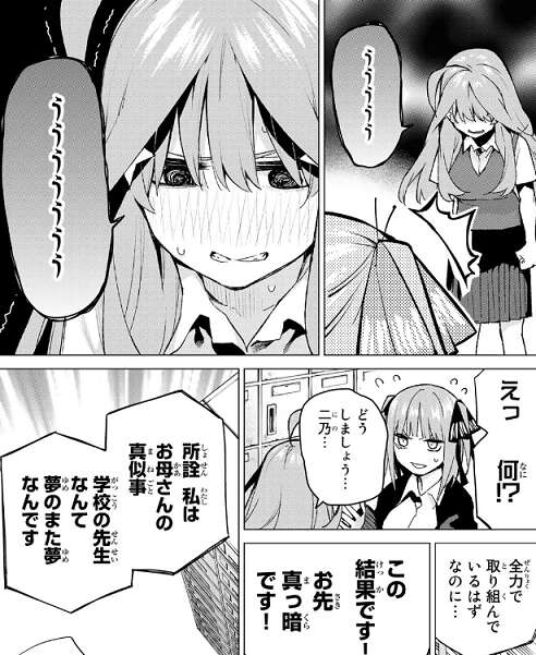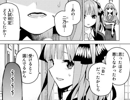 場面変わって二乃と五月が下駄箱で会い、二乃は一緒に帰る人を探している最中でした。五月はこれから直接塾に向かうので一緒に帰れないと言い、二乃は真面目ねと別の人を探しに行こうとします。その時、五月は二乃に入試判定はどうだったか聞きますが、二乃は受けるところを選んでいたため「B」と悪くなかったと答えます。すると五月から変な声が漏れてきます。