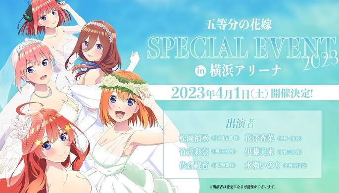 そして、2023年4月1日(土)には、なんと横浜アリーナでスペシャルイベントの開催が決定しました。公演タイトルは、「五等分の花嫁 SPECIAL EVENT 2023 in 横浜アリーナ」です。
