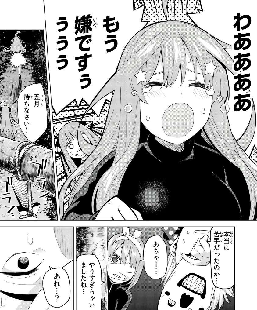 キャンプファイヤーの準備を手伝って丸太を運んでいると、小屋に一花と風太郎は閉じ込められてしまいます。焦る風太郎とどこか余裕の一花です。何とか外に出られないかと、風太郎は一花を肩車して、防犯センサーを作動させようとしますが一花の太ももが…。