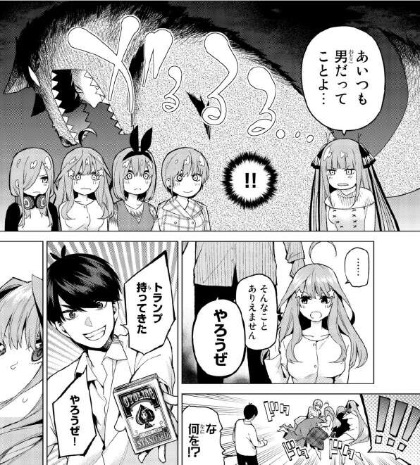 らいはの看病で林間学校には行くつもりがありませんでしたが、五つ子のおかげで林間学校に参加できました。車中でオリジナルゲーム、「五つ子ゲーム」をして楽しんでいますが、風太郎のハイテンションに少々困惑気味です。