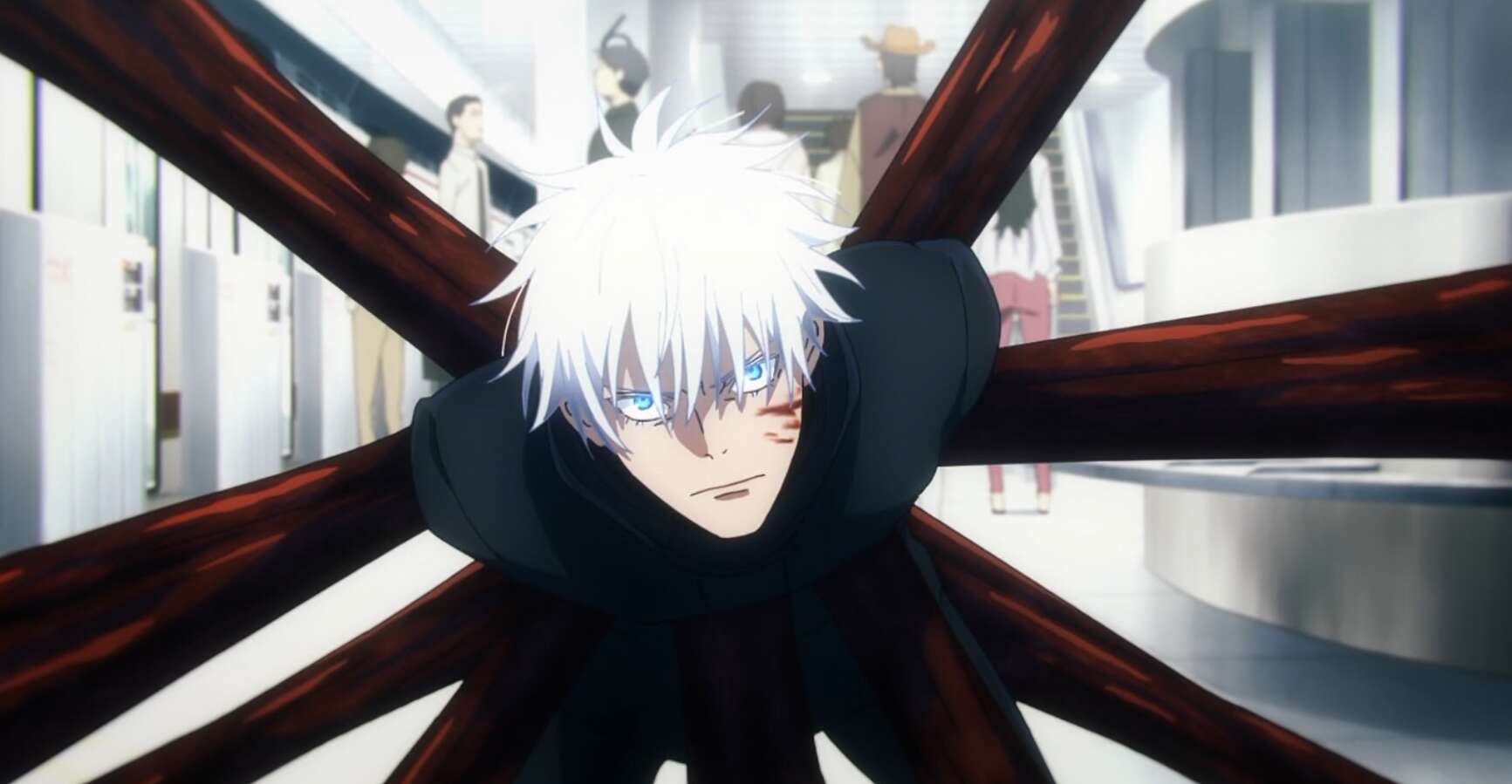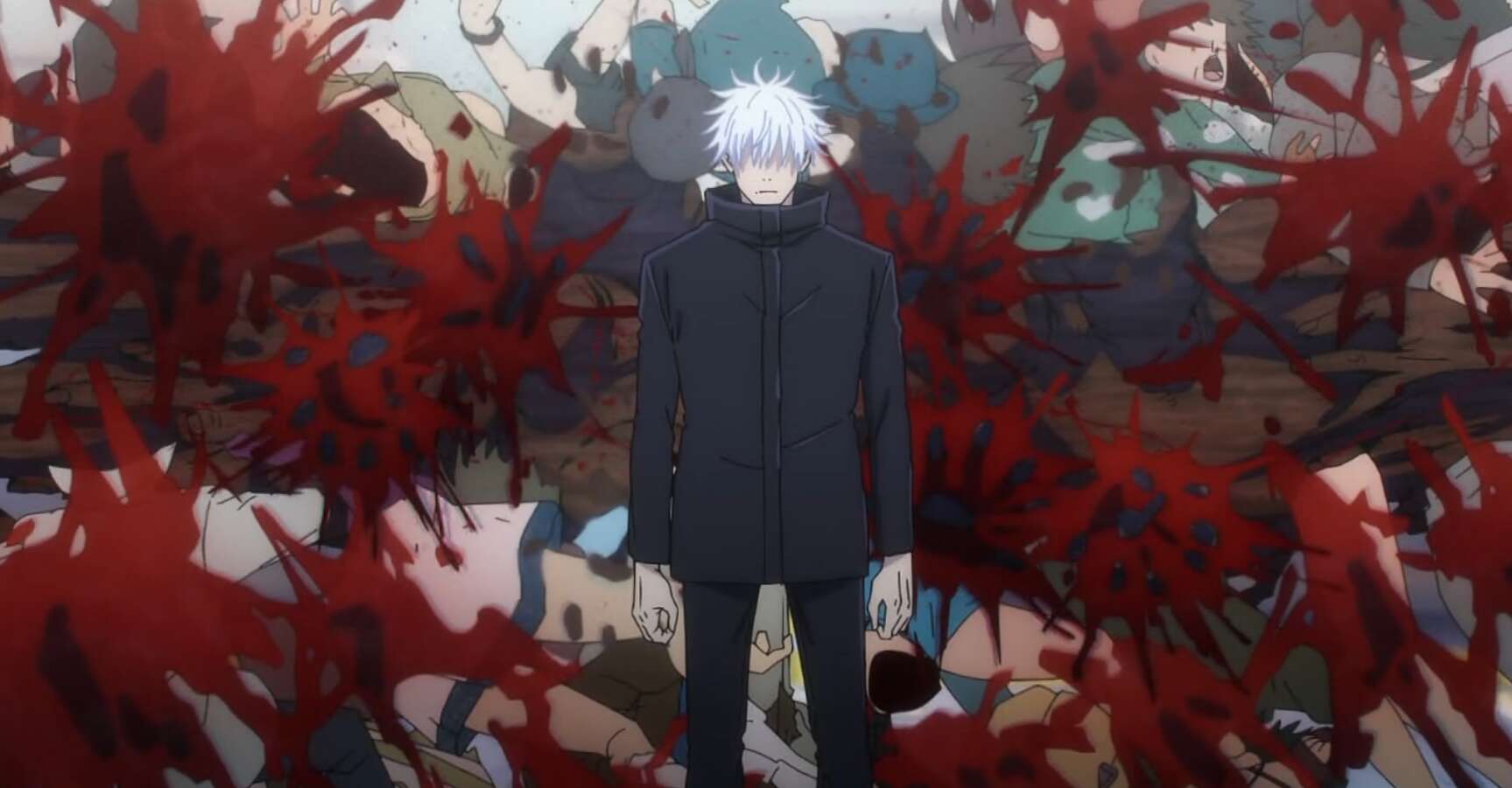 さらに雑草が塞いでいた吹き抜けが開き、そこからも大量の一般人が投入され、真人、脹相、漏瑚が一般人を巻き込みながら同時に五条を攻撃、五条はさらに追い詰められます。