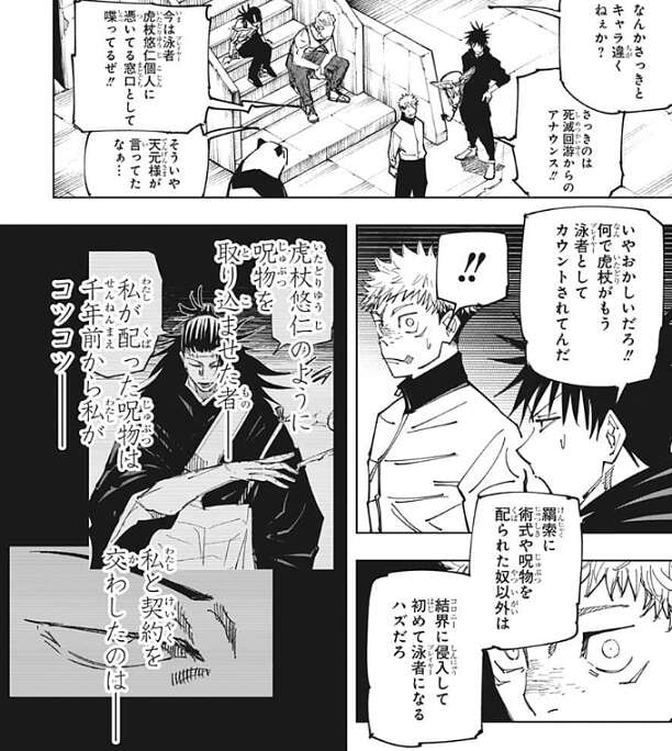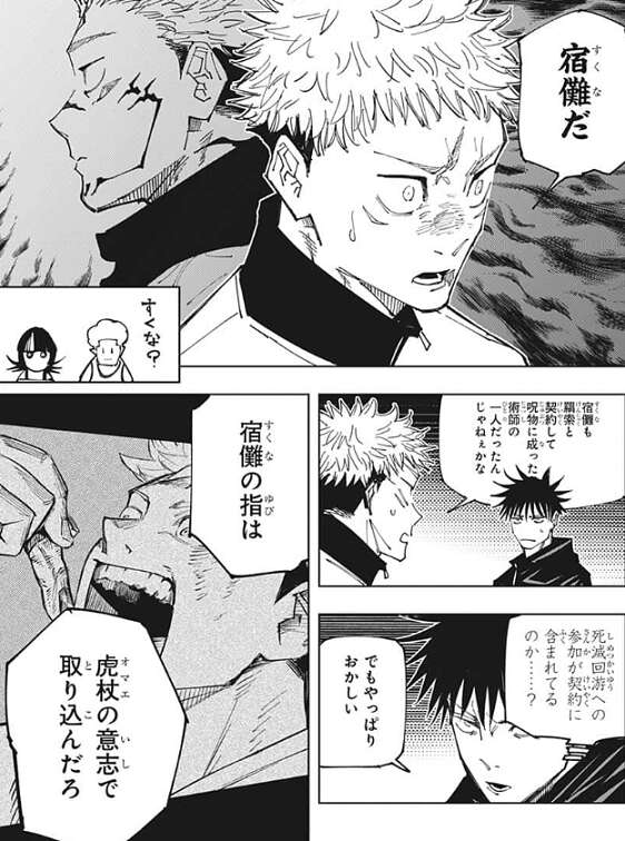 虎杖は羂索の話を思い出し、宿儺が原因だと言います。宿儺も羂索と契約して呪物に成った術師の一人だったんじゃないか、と言いますが、伏黒はそれでもやっぱりおかしいと言います。宿儺の指は虎杖の意思で取り込んだので、虎杖自身は羂索との契約に無関係と伏黒は考えているのでしょうか?しかし、羂索に肉体を乗っ取られたと思われる虎杖の母親が143話で描かれていたので、虎杖自身も過去に羂索と何か関りがあるのは間違いないと思われます。