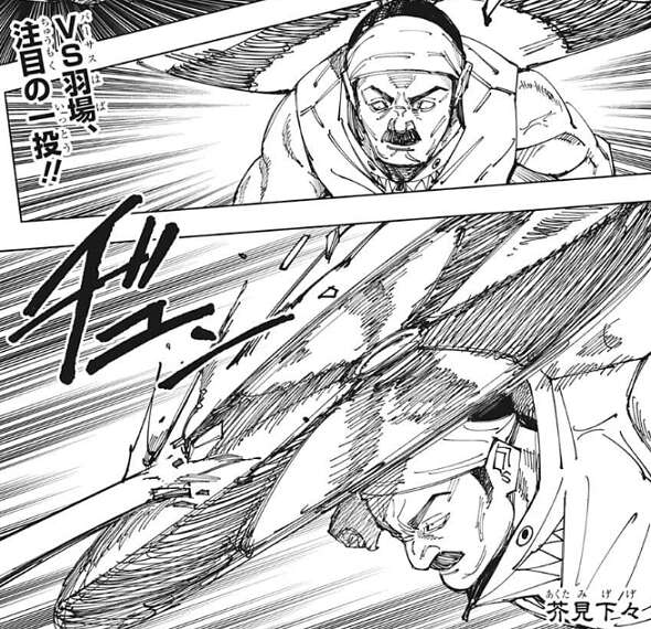 プロペラを使う羽場と虎杖との対決が決着します。羽場は屋内で迎え撃つ虎杖に対して、プロペラを横にして回転させながら進む、虎杖をプロペラで切り刻もうとします。しかし、プロペラを横にして頭頂部を虎杖の方に向けさせるのは、虎杖の読み通りで、羽場の頭頂部に拳を叩き込み、プロペラが止まった羽場を蹴り倒して戦闘不能にします。