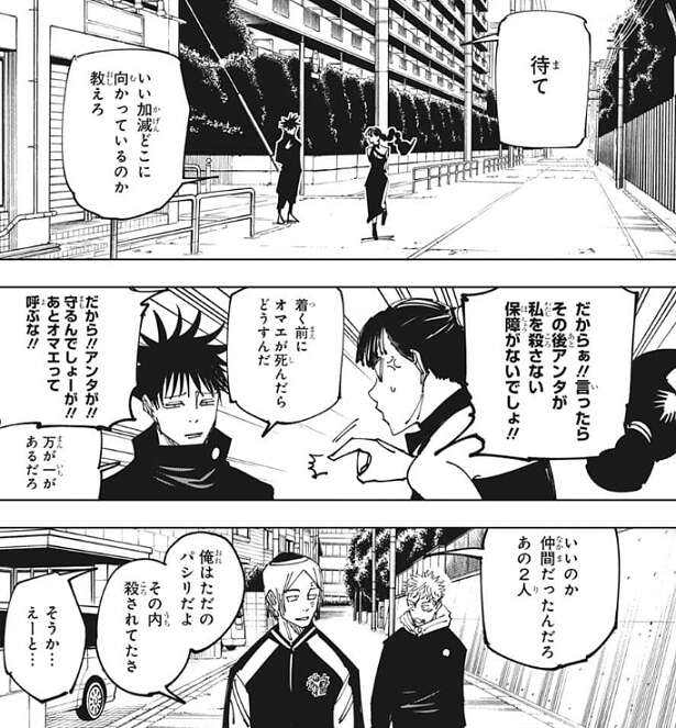 伏黒は麗美に、いい加減どこに向かっているか教えるように言いますが、麗美は言ったらその後自分が殺されない保証がない、と教えようとしません。一方、虎杖は甘井に案内されて、日車がいる場所に向かっていました。