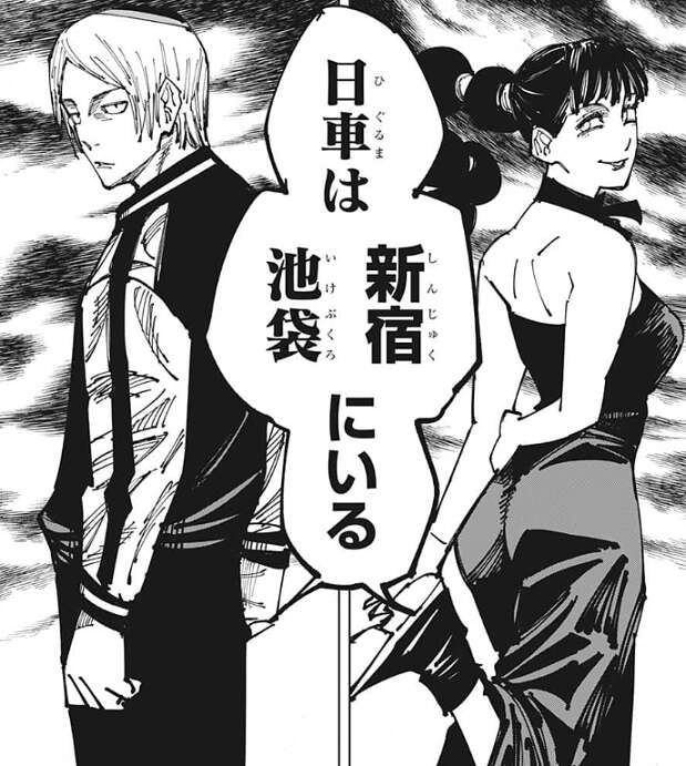 麗美はザックリとなら教えてもいい、と日車が新宿にいることを伏黒に教えます。甘井は、強い奴程、物資が豊富な栄えてたところに集まると言い、日車は池袋にいることを虎杖に教えます。伏黒は新宿へ、虎杖は池袋を目指すことになりますが、どうやら麗美と甘井のどちらかは嘘を言っているようです。