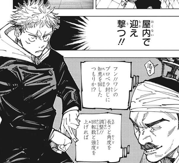 驚いた羽場ですが、プロペラを使って自分の足を掴んでいる虎杖を攻撃、虎杖はビルを移動して距離を取ります。虎杖はビルの屋内に入ると、屋内で羽場を迎え撃とうとします。羽場は、虎杖が自分のプロペラを封じるために、屋内に入った事を見抜きます。羽場はプロペラの長さと角度を調整し、回転数と強度を上げて屋内の虎杖を直接攻撃しようとします。