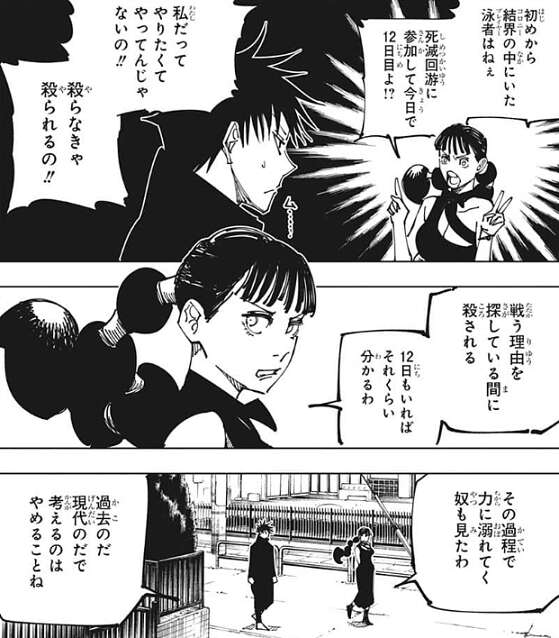 一方、麗美と一緒に行動している伏黒は、麗美が現代の術師で、死滅回游に参加して12日目で、殺らなきゃ殺られる状況にある事を聞いていました。過去の術師に触発されて、現代の術師も戦闘モードになっているようで、虎杖に余計な事を言っちまったな……、と伏黒は後悔します。