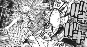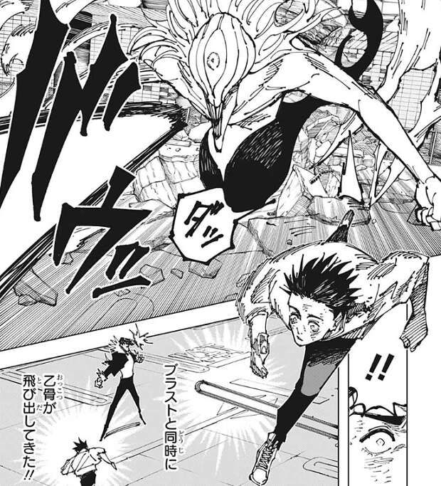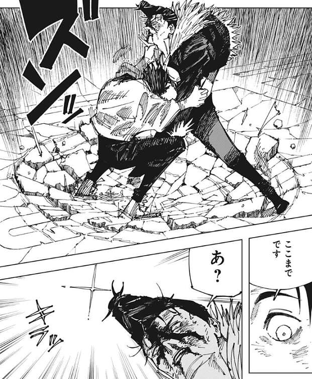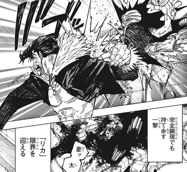 石流は乙骨との接続が切れた「リカ」に全力でパンチを浴びせると、完全顕現でも持て余す石流の一撃をくらい「リカ」は限界を迎えて消えていきます。一方、乙骨と石流は激しい格闘戦を繰り広げていました。