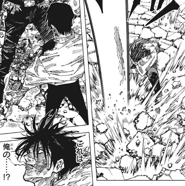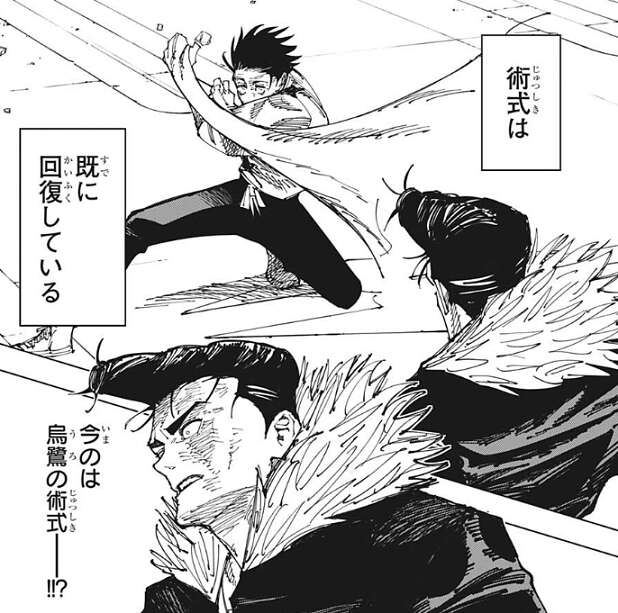 しかし、乙骨の術式は既に回復していて烏鷺の術式をコピーし空間を歪めると、石流のグラニテブラストの軌道を上空へと逸らします。乙骨の術式が“模倣(コピー)”だと気付いた石流は、いつ術式の条件を満たしたのかと驚きの表情を浮かべます。