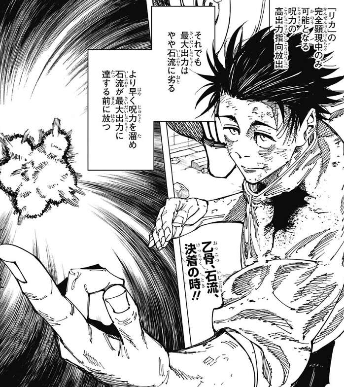 「リカ」の完全顕現中のみ乙骨は呪力の高出力指向放出が可能となりますが、それでも最大出力は石流に劣り、より早く呪力を溜めて石流が最大出力に達する前に放つ必要がありました。