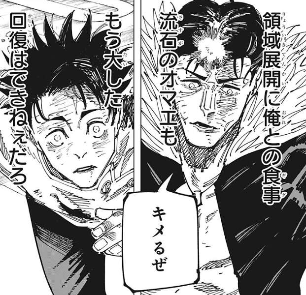 結局、石流の呪力の方が上回り乙骨は攻撃をくらってしまいます。一方石流は、マジでSweeTだぜ…!!乙骨!!と、乙骨を褒めますが、立ち上がる煙の中に乙骨の気配を感じ、石流は何回でもやろうと叫びます。