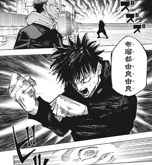 宿儺が現れたのを見て、伏黒は布瑠部由良由良(ふるべゆらゆら)と唱えて、八握剣異戒神将魔虚羅(やつかのつるぎいかいしんしょうまこら)を召喚しようとします。