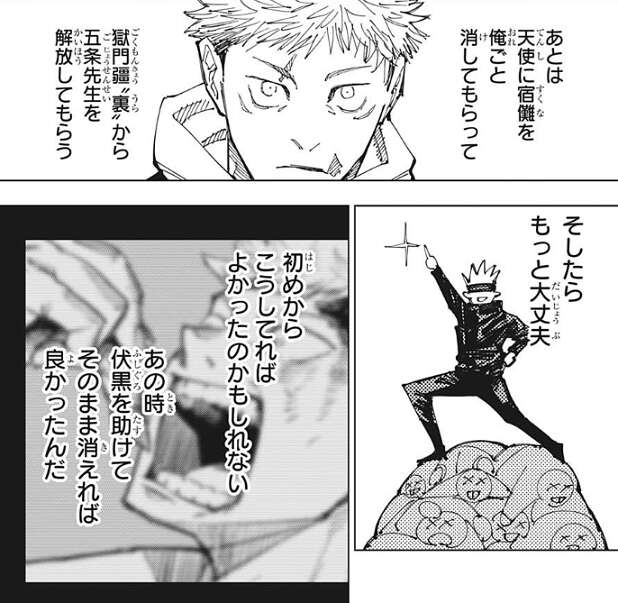 次に津美紀が結界(コロニー)内に転送され、伏黒と虎杖の前に現れた場面に写ります。伏黒と津美紀が会話している傍で、このまま事が進んで津美紀が死滅回游から離脱すれば、もう伏黒は大丈夫だと考えています。そして、天使に宿儺を自分ごと消してもらって、獄門疆“裏”から五条を開放してもらおう、と虎杖は考えます。やはり虎杖は、自分が死ぬことで五条を復活させようと考えているようです。