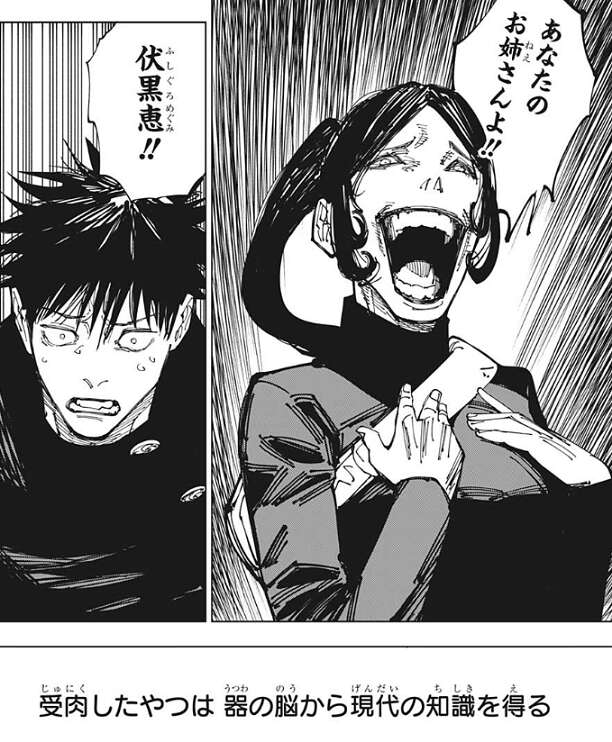 伏黒が、オマエ………誰だ!?と聞くと、あなたのお姉さんよ!!伏黒恵!!と、津美紀は叫びます。ここで伏黒は、津美紀が覚醒タイプのプレイヤーではないと気付きます。受肉タイプのプレイヤーは、受肉した器の脳から現代の知識を得るので、脹相や宿儺は問題なく現代でも行動できます。