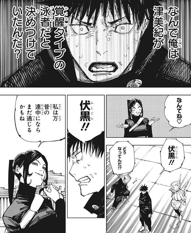 よって、器の記憶を読み取り、器本人として振舞うことも可能なはずだ、と伏黒は考えます。伏黒は、津美紀を覚醒タイプのプレイヤーだと決めつけていた事を悔やみ、津美紀が受肉タイプのプレイヤーで、津美紀の記憶を読み取り、津美紀の振りをしていたのだと気付きます。津美紀に受肉したのは「万(よろず)」という名前の人物のようで、昔の連中になら万と言う名前で通じるかも、と万は言います。