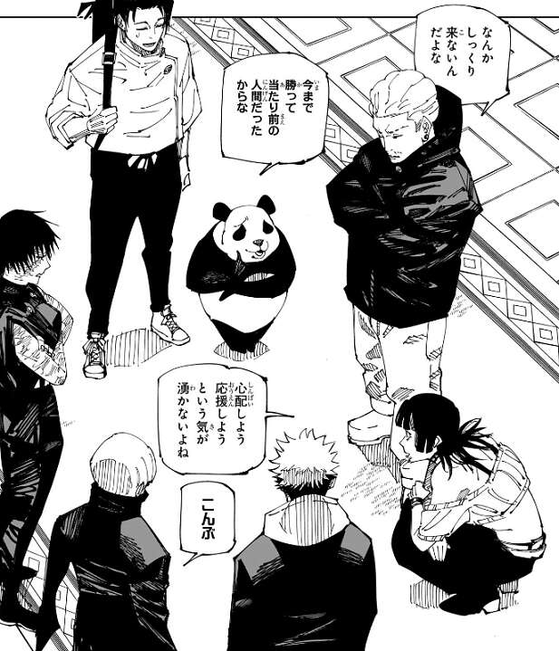 一方、虎杖達が集まり、宿儺との最終決戦に挑む五条を励まそうとしています。しかし、今まで勝って当たり前の人間だった五条をどう励ますか、皆で悩んでいます。あまり、心配しようとか、応援しようという気が誰も湧かないようです。