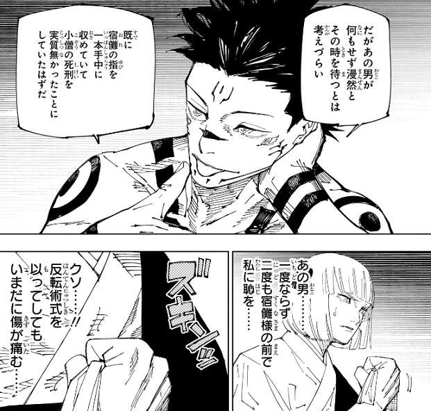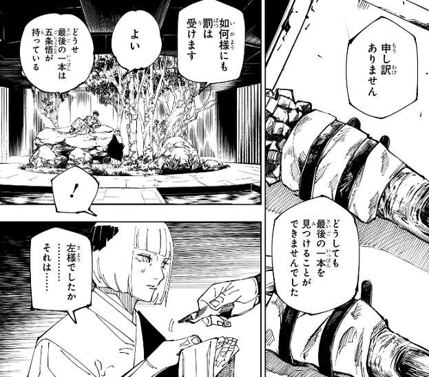 裏梅が宿儺の最後の一本を除いた残りの指を用意しており、宿儺は五条戦に備えてその指を取り込みます。しかし、裏梅でも最後の一本はどうしても見つけられることが出来ず、如何様にも罰は受けます、と宿儺に言って謝ります。しかし、宿儺は最後の一本はおそらく五条が持っていると言い、気にしません。