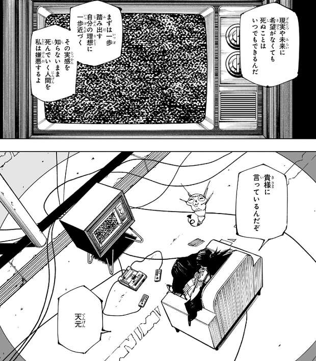 羂索がコガネと会話をしていて、死滅回游のプレイヤーで一度も結界(コロニー)に入場せず、術式を剥奪された者は何人いるか?と、コガネに聞いています。コガネから61名いると聞き、殺されることを恐れたのか、殺すことを恐れたのか、と自分に問いかけますが、違うな、その61人にそんな直感的な感情はない、と断言します。日車寛見の追加したルールがあれば、どちらも回避できたのだから、と羂索は言い、誰だって命をかける勇気を持っているわけじゃない、だが他人に勝手に命をかけられてしまったらあとは行動するしかないじゃないか、とつぶやきます。羂索は、まずは一歩踏み出す、自分の理想に一歩近づくべきだと言い、その実感を知らないまま死んでいく人間を嫌悪するよ、と一度も結界(コロニー)に入場せず術式を剥奪された61人を嫌悪するような言い方をします。そしてこれは天元に言いたかった事のようで、貴様に言っているんだぞ天元、と羂索は一人つぶやきます。