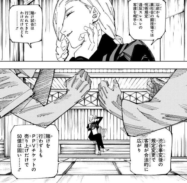 場面はさらに変わって、冥冥は五条悟と宿儺との戦いで儲けようとしていて、その事をつぶやいています。渋谷事変後の規定変更で賭け試合の客層が合法的に広がり、賭けを行わなくてもPPVチケットの売り上げだけで50億は固い、と冥冥は言います。おそらく、五条悟と宿儺の戦いを冥冥の術式で中継し客に観戦させて儲けようと、冥冥と憂憂は考えているようです。その横で虎杖と日下部が、特訓のような事をしています。