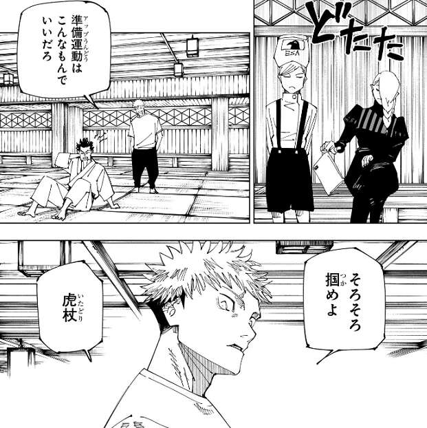 虎杖が日下部を柔道の投げ技で投げ飛ばし、アップ運動はこんなもんでいいだろう、そろそろ掴めよ、虎杖、と日下部に話しかけています。しかし虎杖が日下部に“虎杖”と言っている所から、どうも虎杖と日下部の肉体と精神が入れ替わっているように見えます。しかし、何の特訓をしているか含めて詳細は不明です。