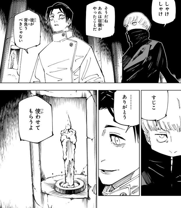 場面は乙骨と狗巻の会話に移り、狗巻の腕の事で話をしていますが、狗巻の腕は宿儺がやった事だから虎杖が背負うべきじゃない、と乙骨が言います。そして、狗巻が何か言い、乙骨がお礼を言った後、使わせてもらうよ、と狗巻に言います。何を乙骨が使わせてもらうのか、こちらも詳細は不明ですが、狗巻と話している事から術式「呪言」に関する事でしょうか?