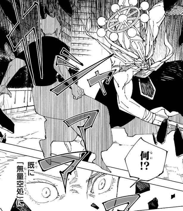 魔虚羅の攻撃で五条の領域は破壊されてしまいます。五条は、既に「無量空処」に魔虚羅が対応している事に驚きます。