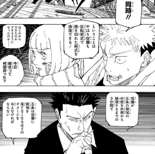 同時に領域展開が行われ、五条と宿儺は領域内で戦いを繰り広げます。モニターで見ていた天使は、宿儺が反転術式で焼き切れた術式を修復できたのが、初めから出来ていたのか、出来るようになったのか、気にしますが、今日術式って何回言った?と、誰かがツッコミを入れます。228話で宿儺が五条の領域の外殻を外側から破壊するのに3分かかる事が判明しましたが、その3分間で五条が宿儺に領域を保てなくなるほどのダメージを与えなければなりません。