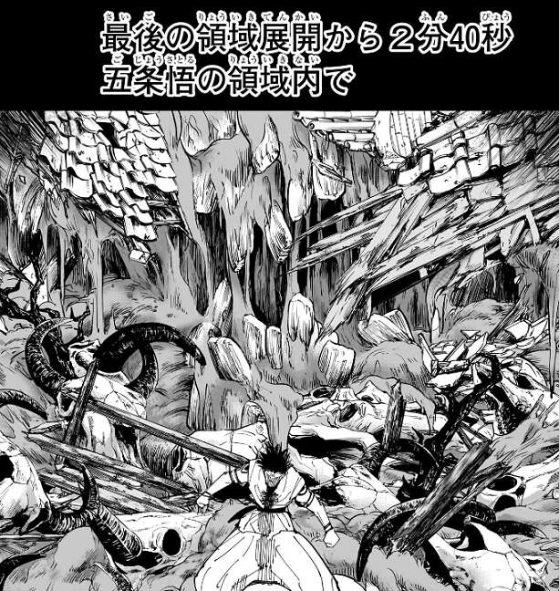 0.01秒にも満たない時間ですが、宿儺は一瞬「無量空処」をくらって顔を歪めます。その後五条と宿儺は領域内で戦いを行い、最後の領域展開から2分40秒、五条悟の領域内で「伏魔御廚子」が崩壊します。家入の行っていた通り展開、3分以内に「伏魔御廚子」を崩せれば五条が勝つ、という展開となります。