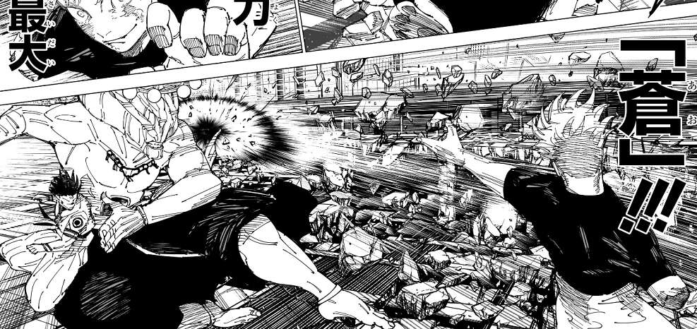 さらに影から宿儺も出てきて五条に蹴りを入れます。宿儺の蹴りで吹っ飛ぶ五条に、顎吐が雷撃の効果を加えてパンチをさらに加えますが、さっきからオマエだけ釣り合ってねーんだよ、と顎吐のパンチに耐えた五条は顎吐に言い放ちます。そして、無下限呪術に適応していない顎吐に、無下限呪術を応用した拳を浴びせます。