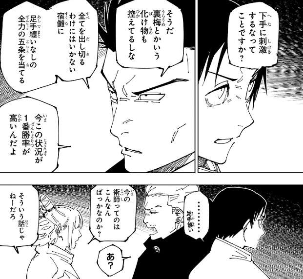 裏梅もいるので、下手に刺激して宿儺が切り札を出してしまうより、全てを出し切るわけにはいかない宿儺に足手纏いなしの全力の五条を当てるのが、一番勝率が高い、と日下部は言い、乙骨もしぶしぶ納得して戦いへの乱入を止めます。しかし、鹿紫雲一だけは納得せず、これは五条のための戦いだから、どうなろうと割って入るのは野暮ってもんだ、と鹿紫雲一はつぶやきます。