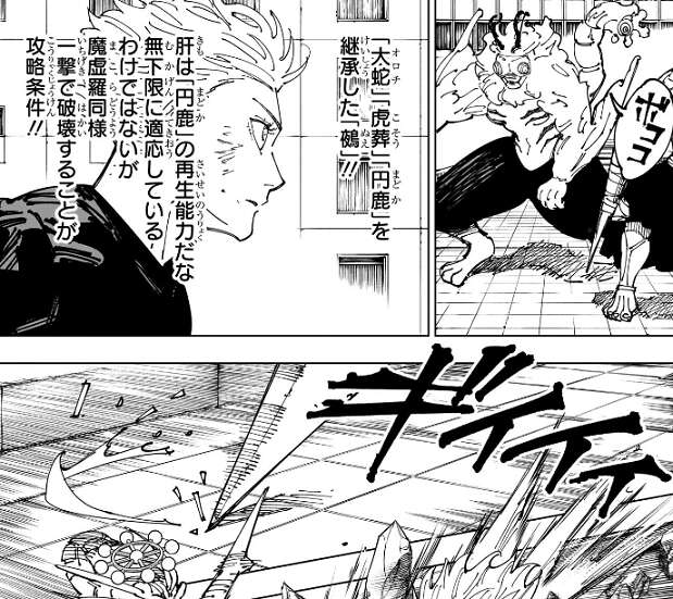 場面は3対1で戦っている五条に戻り、魔虚羅の攻撃を五条がよけるとその攻撃が顎吐に直撃します。しかし、顎吐は受けた傷をすぐに再生能力で治し、五条を攻撃します。五条は顎吐の尻尾部分をブチィと引きちぎりますが、この傷もすぐに再生します。顎吐には「円鹿」の再生能力があり、これは顎吐が継承した「鵺」に「大蛇」「虎葬」「円鹿」の能力を継承させているようです。顎吐も魔虚羅同様に、一撃で破壊することが攻略条件と五条は分析します。