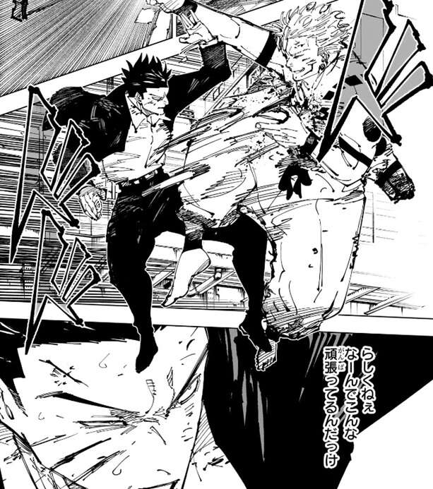 しかし、宿儺の体が頑丈なのか、呪力で強化しているせいか、日下部の刀は居合で斬っている途中で折れてしまいます。すると今度は、日下部は近接戦闘に切り替え、宿儺に蹴りやパンチをくらわせます。